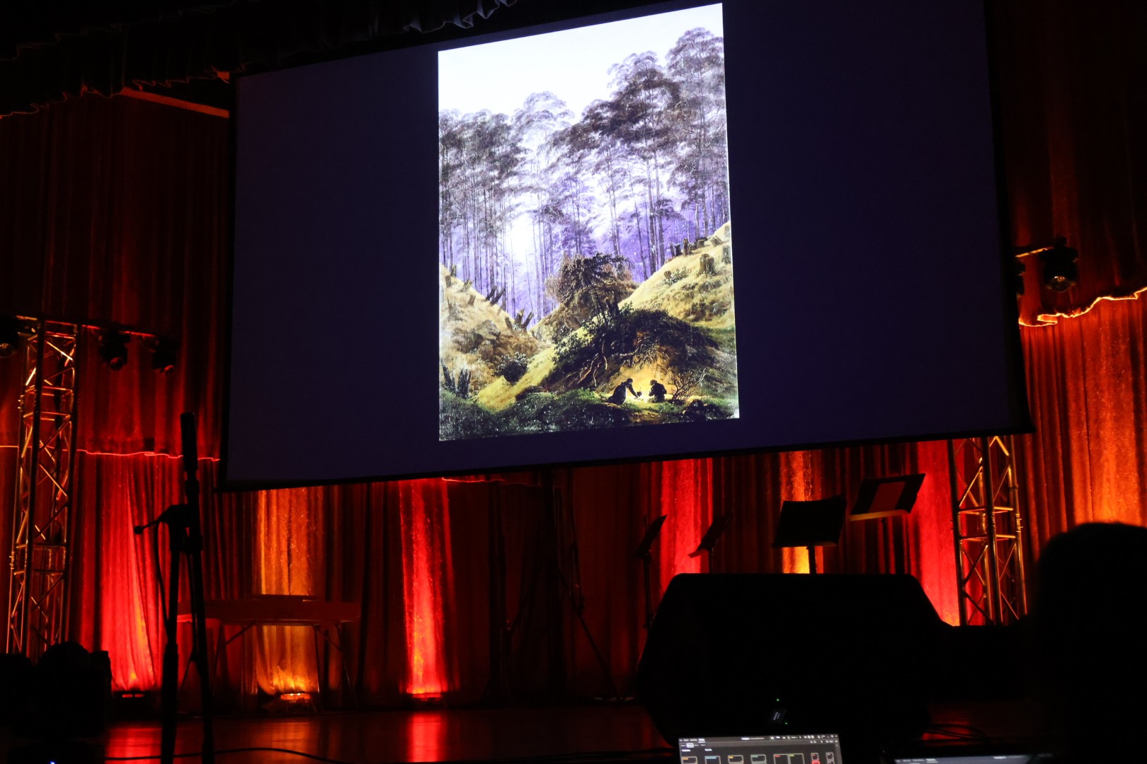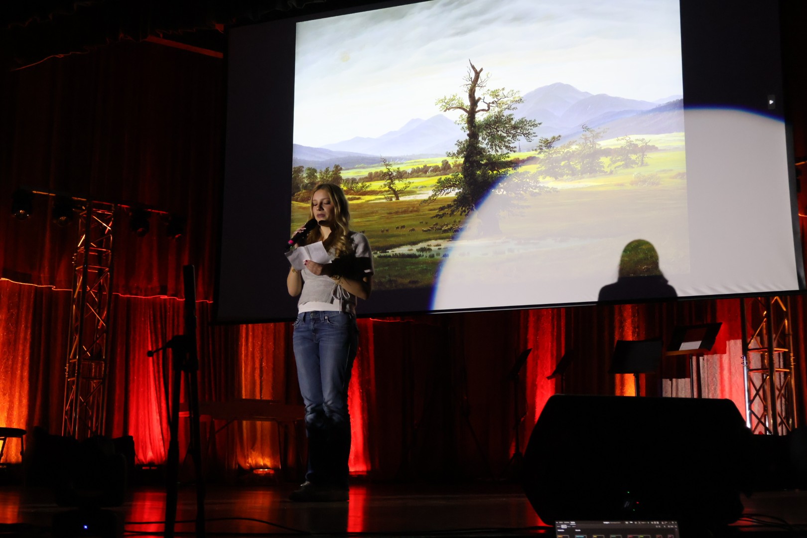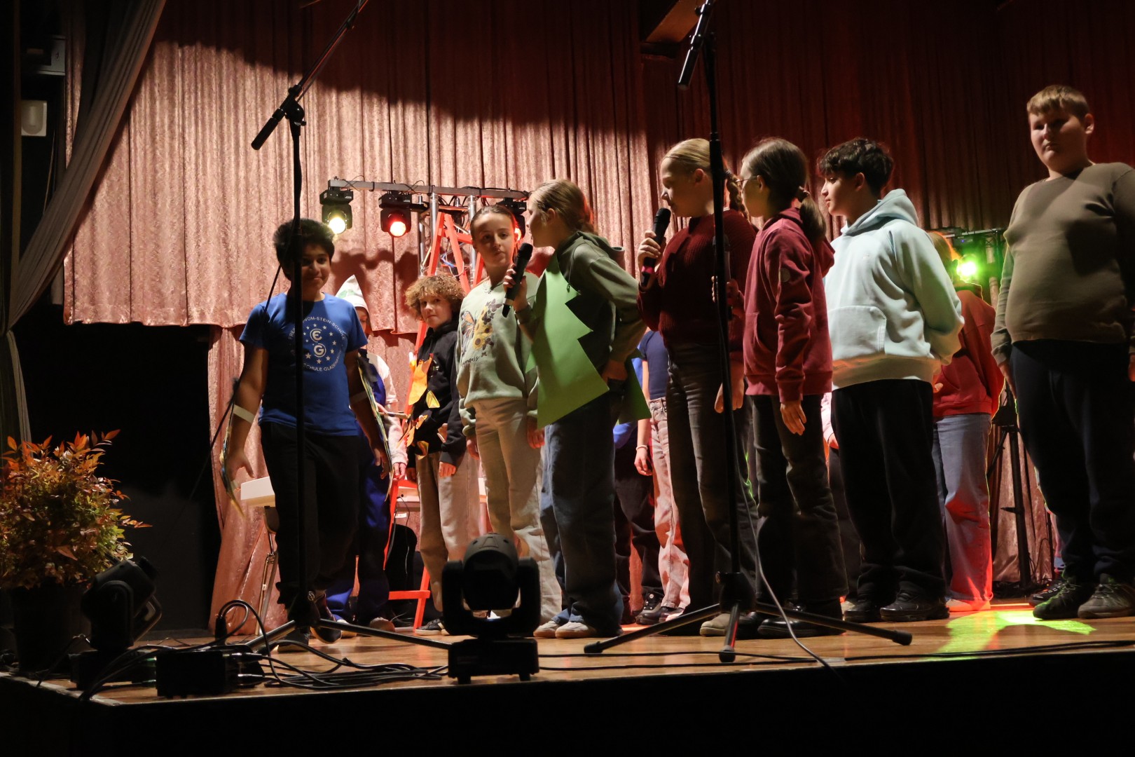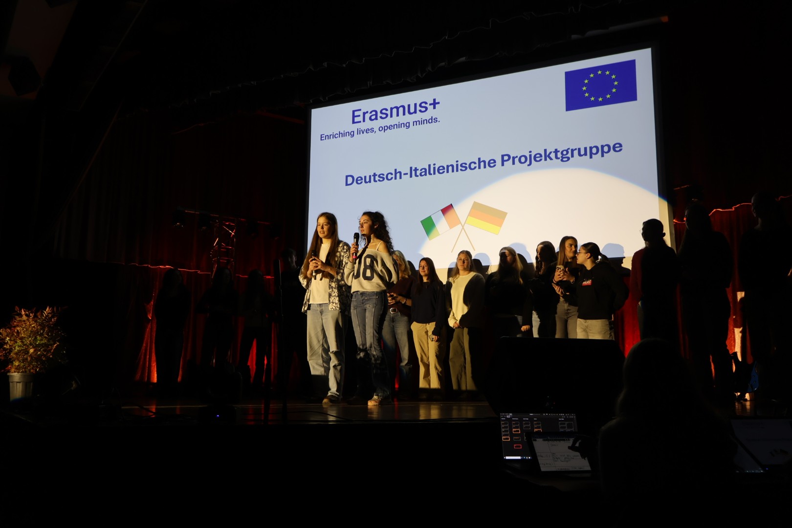 Im ersten Beitrag des Abends präsentierte sich die Theater-AG (R. Finke) mit ihrer gelungenen Inszenierung zu dem Gedicht „Dunkel war`s“. Getanzt wurde gleich zwei Mal: zunächst die 5F4 (J. Zaremba, A. Waldschmidt) mit ihrer schwungvollen Choreographie zu „Cotton Eye Joe“; am Ende des Abends beeindruckten Maleek, Liv, Hanna, Viktoria und Arges aus der Q1 mit ihrer Choreografie zu „Yeah“. Selbstverständlich wurde auch fleißig gesungen, so etwa die IKL aus der Grundschule mit den beiden Liedern „Ihr Blätter wollt ihr tanzen“ sowie „Heladiladilo“ (A. Ruppert-Damm). „Der Herbst steht auf der Leiter“ wurde von der Klasse 6F3 (N. Placzek-Ouaissa, C. Eidam-Blume) aufgeführt. Nicht fehlen durften natürlich die Beiträge der Show-AG (R. Erkel), die mit „Tell me that you love me“ und „Blinde Passagiere“ auch dieses Mal wieder für Gänsehautmomente sorgte. Instrumental imponierte erstmals Adm Mousa (Klasse 9R3) mit dem Klassiker „Fly me to the moon“ sowie dem arabischen Stück „Nasam alena alhawa“ auf seiner Violine. Und auch „The Bass Boys“, namentlich Simon Richter und Josua Smolny aus der Klasse 8G3, die mit „Only you“ und einem „Michael Jackson – Medley“ das Publikum begeistern konnten (T. Geitz). „The Six on Stage“ aus dem Jahrgang 10G präsentierten eindrucksvoll mit ihren Blasinstrumenten die Stücke „oj dorth“, „Wiegala“ und „Shir hawaalot“ (K. Guhl). Auf der Klarinette zeigte Davona Kinas (8G3) ihre Fingergeschicke bei dem zügigen und imposanten Stück „Clarinet Express“ (T. Meisner). Künstlerisch ging es auch auf sprachlicher Ebene zu: Der Leistungskurs Deutsch der Q1 (S. Kersten) las romantische Impressionen zu Gemälden von Caspar David Friedrich vor, die während des Unterrichts erstellt wurden. Informativ wurde es, als die deutsch-italienische Erasmusgruppe (W. Borschel, I. Younkin) dem Publikum die Partnerschule in Turin vorstellte. Seit bereits über drei Jahrzehnten findet der Austausch mit europäischen Ländern auf Schulebene statt und ermöglicht das Kennenlernen neuer Kulturen, das Vertiefen von Sprachkenntnissen und das Ermöglichen von internationalen Freundschaften und Kontakten. Davon zeugte auch der gemeinsame Auftritt, den die italienischen Schülerinnen und Schüler mit ihrer Nationalhymne beendete. Der gelungene Abend zeigte somit auch diesmal die kulturelle Vielfalt der Europaschule Gladenbach und ließ Schülerinnen und Schüler verschiedener Jahrgänge auf der Bühne glänzen.