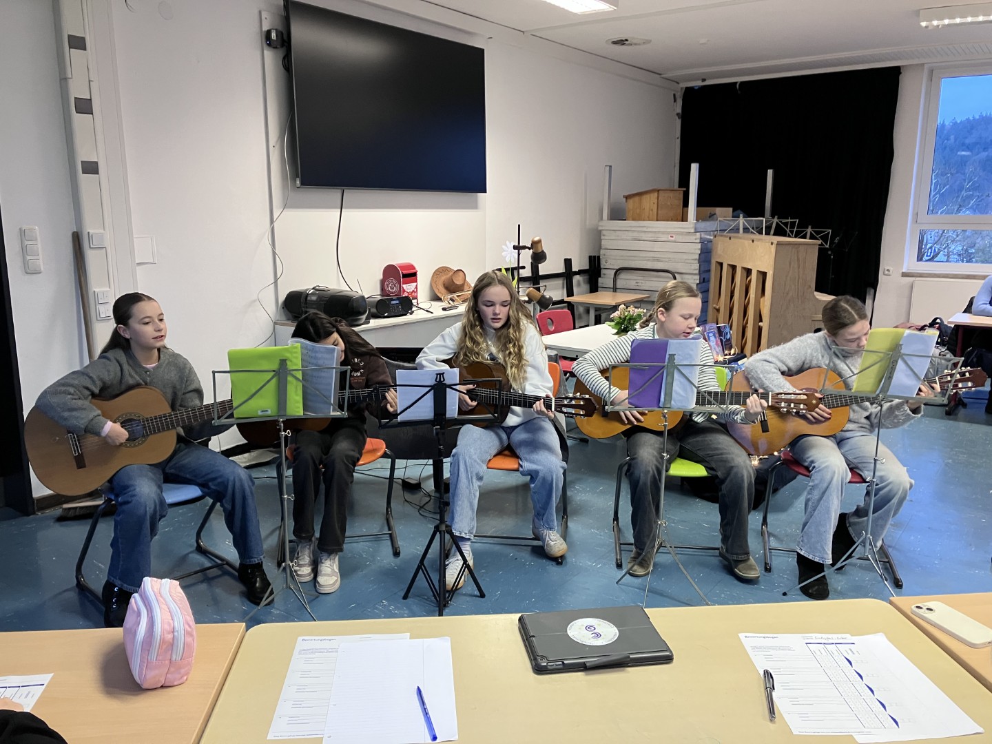 Musikalisch unterstützt wurde die Veranstaltung von vier Gitarrenspielerinnen aus dem 6. Jahrgang. Sie sorgten mit den Songs „Applaus, Applaus“ (Sportfreunde Stiller) und „Ich liebe den Frühling“ (S. Sommerland) für eine gemütliche, feierliche Atmosphäre.